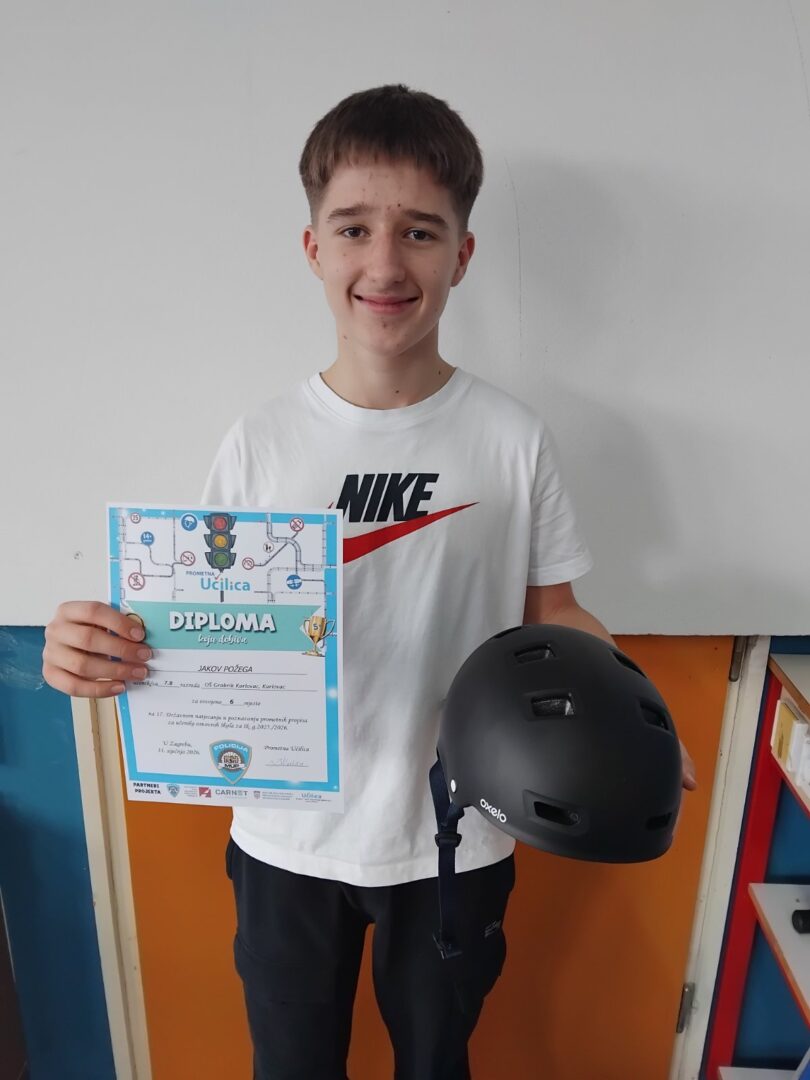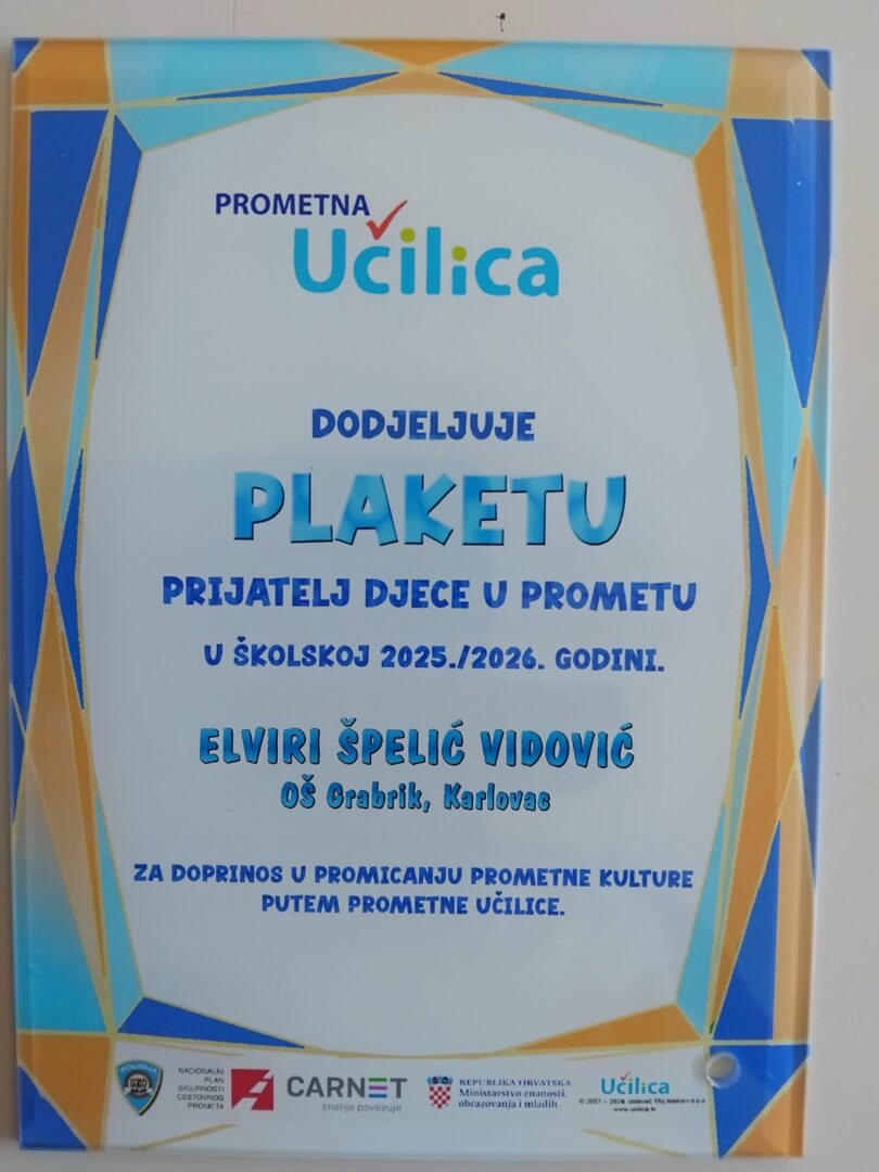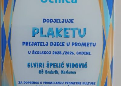 Za pokazano znanje pohvaljeni su još. Lucija Šabanagić,5.d, Mia M. i Gabrijel L. iz 6.a, te Franka J., 7.c. Njihova mentorica Elvira Špelić Vidović nagrađena je peti put za redom Plaketom „Prijatelj djece u prometu“. Čestitamo svim sudionicima na plasmanu.