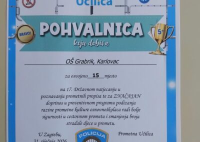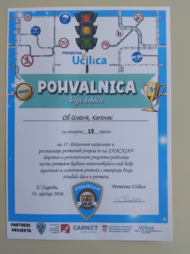 Završilo je 17.Državno natjecanje „Prometna učilica“. Na natjecanju su sudjelovale 383 škole iz cijele Republike Hrvatske. OŠ Grabrik zauzela je 15.mj. Na natjecanju je sudjelovalo 120 učenika naše škole a posebno se istaknuo učenik Jakov P., 7.b, osvojivši 5.mj u kategoriji sedmih razreda i nagrađen je Pohvalnicom i biciklističkom kacigom.