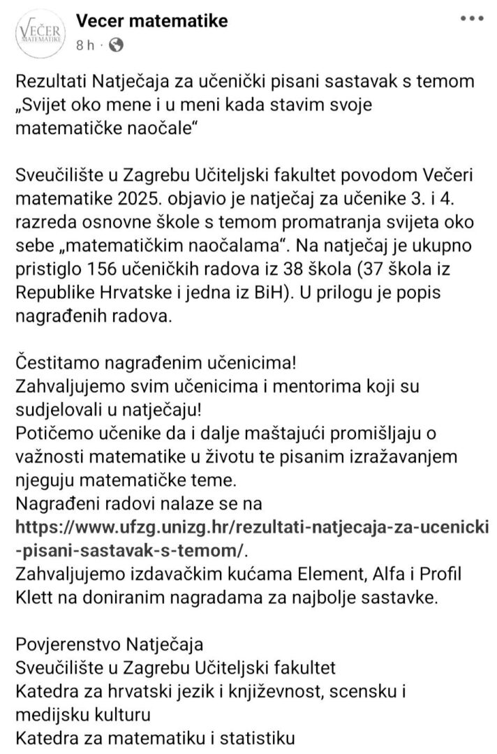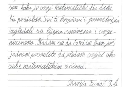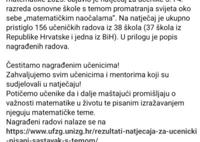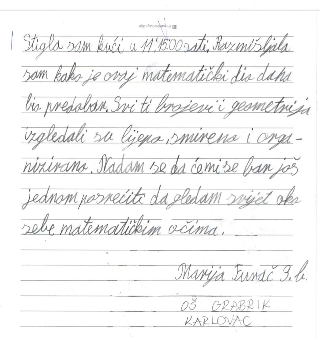Učenica naše škole Marija F. nagrađena je na Natječaju za učenički pisani sastavak s temom “Svijet oko mene i u meni kad stavim svoje matematičke naočale”.